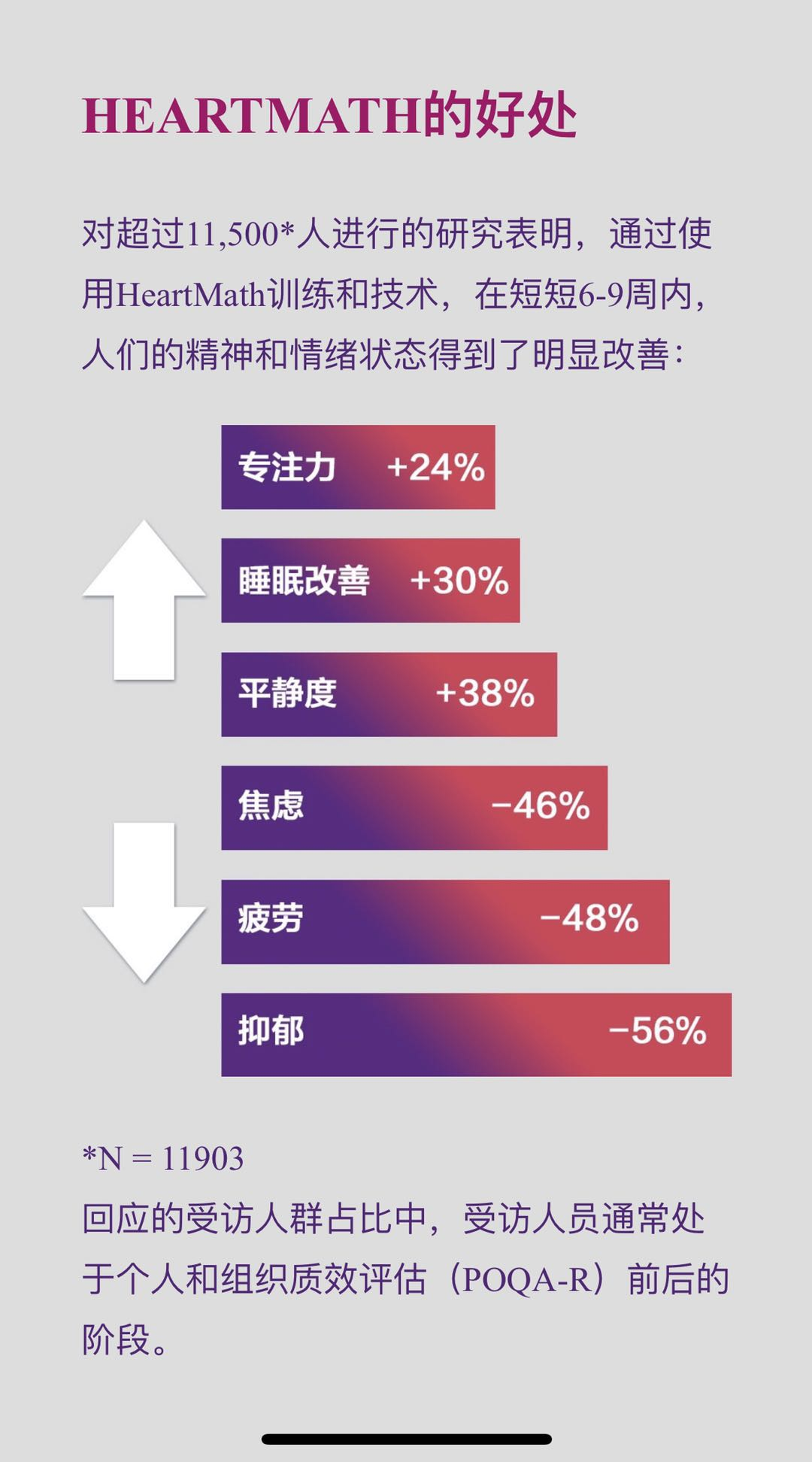 HMC的课程将帮助人们在面对压力的时候,降低焦虑对他们身体以及工作效率的影响,与此同时,他们大概率的会拥有更高品质的睡眠、更强大的修复能力、更强的专注力、决策力和直觉力。